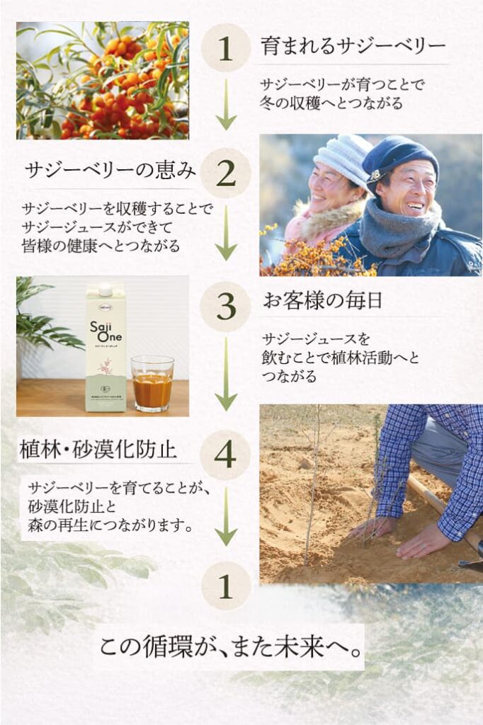 SajiOneシリーズのサジージュースは、私たちの健康だけでなく、現地の方たちの雇用や砂漠地域の緑化、そして緑化による環境改善に繋がっています。