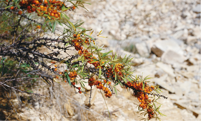 サジーベリーは、荒れた大地でも力強く根を張り、ほかの植物が育ちやすい土壌環境を生み出します。