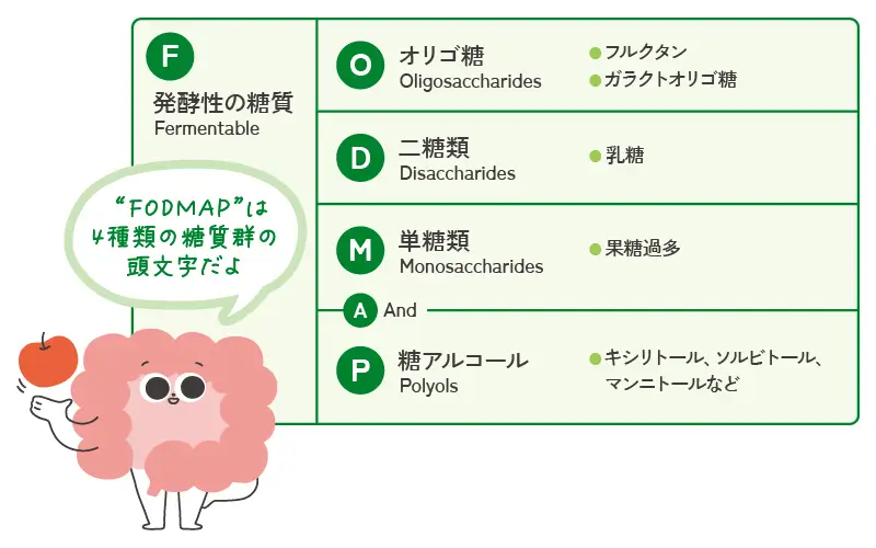 FODMAPとは、おなかの中で消化されにくい種類の糖質(炭水化物)のこと。