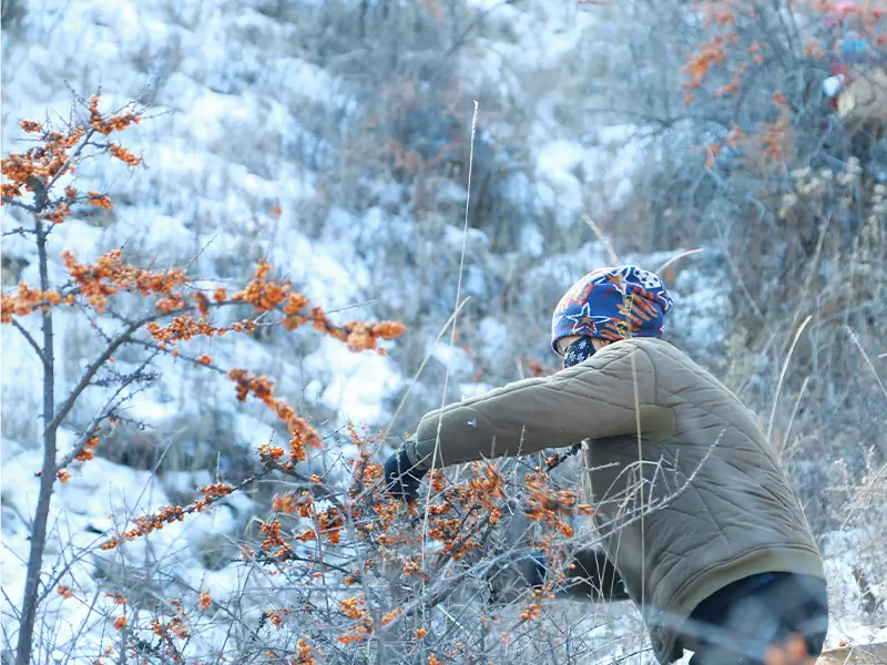 サジーの枝には鋭い棘があるため、手を守る厚手の手袋も欠かせません。この重厚な装備は、厳しい自然への敬意と、自分たちの仕事への誇りの証でもあります。
