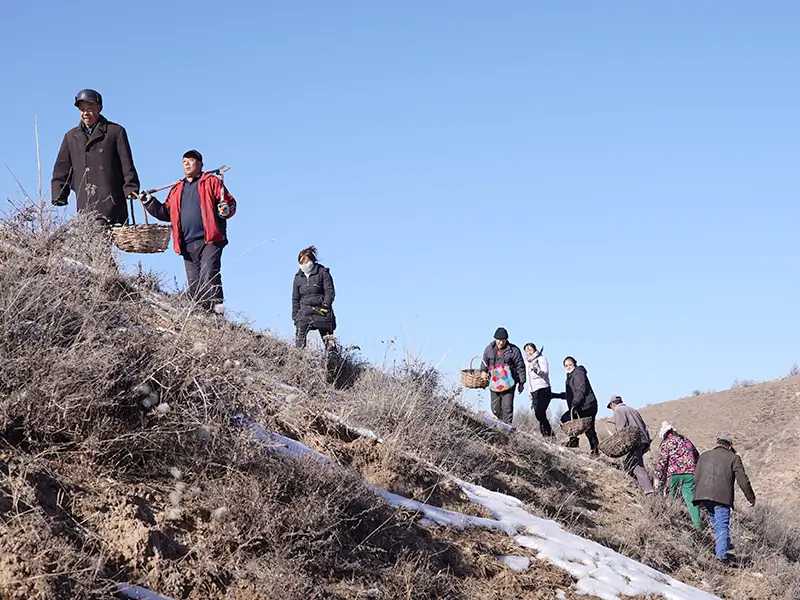 家族や近所の方々と手を取り合い、5〜10名ほどのチームで進む道のり。白い息を弾ませながら進むその先には、オレンジ色に輝くサジーの実が待っています。