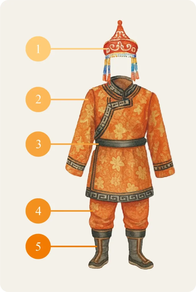 広い草原で暮らす遊牧民にとって、衣は「命を守る道具」でした。 昼夜で30度も気温が変わる厳しい環境で、厚手の毛織物を腰帯(ブス)でぎゅっと締めることで、冷たい風から身を守ります。