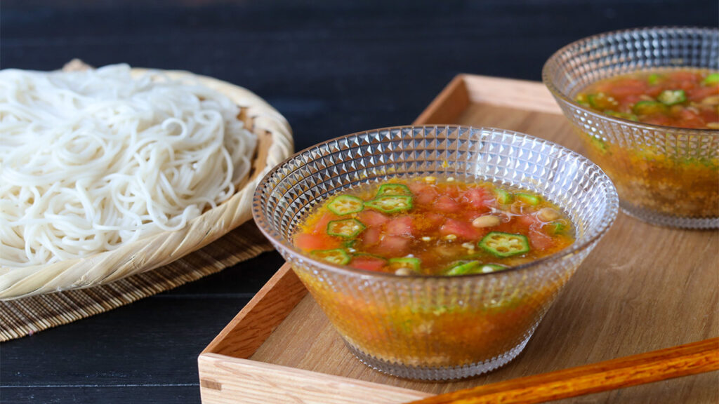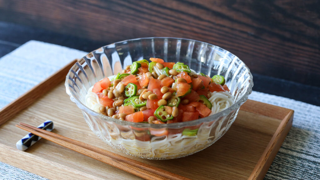 - サジージュースを加えてさっぱり、めんつゆに爽やかな風味が加わり、食欲がない夏に最適な栄養満点のねばねばそうめんです。